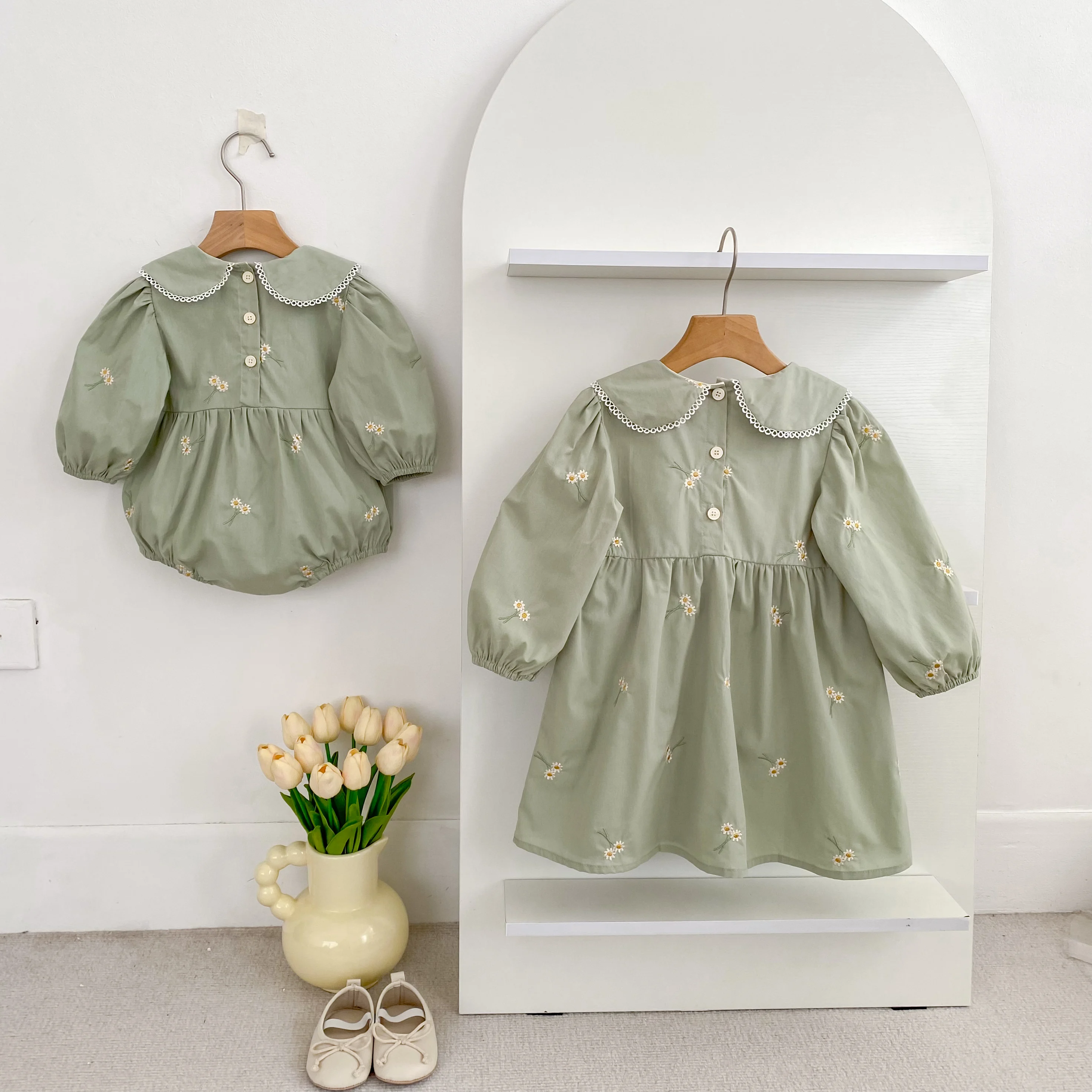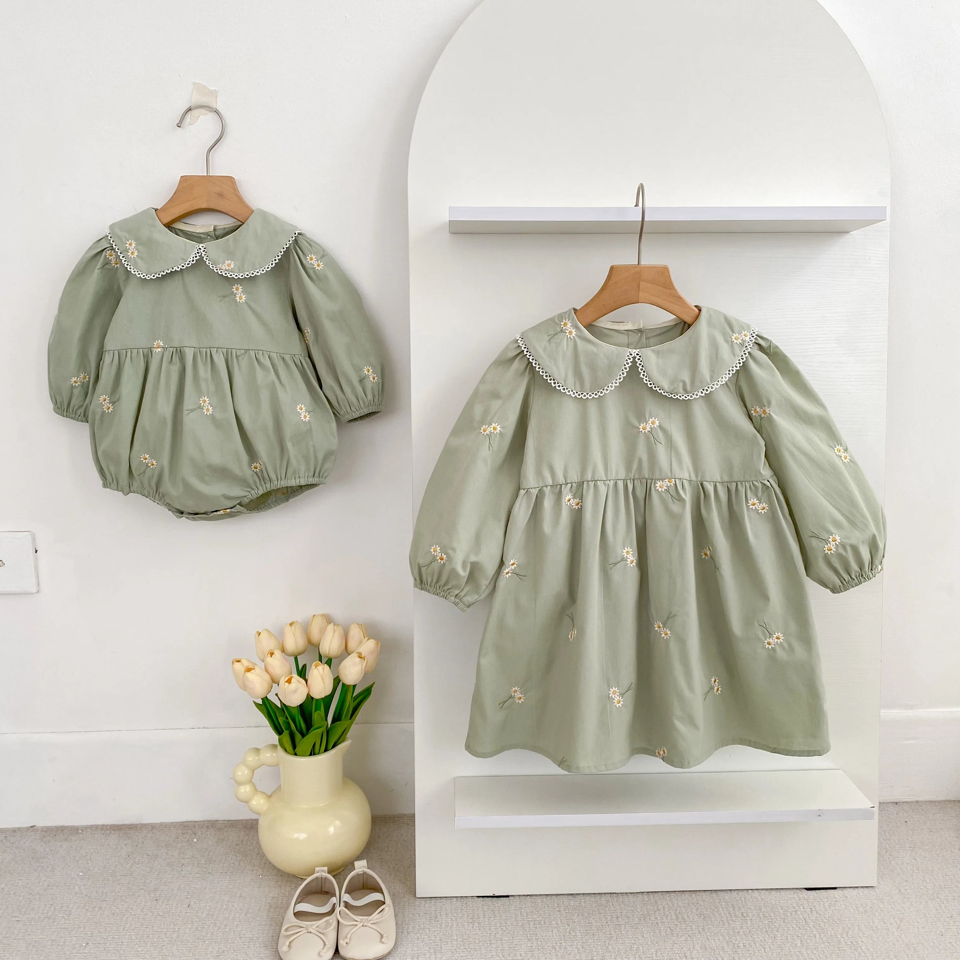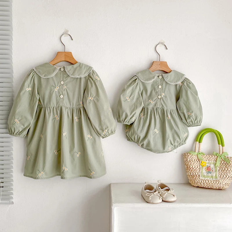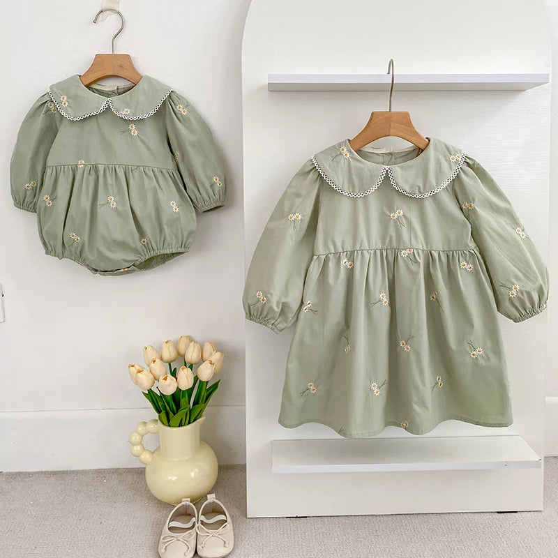 Celebra la dulzura de la infancia con este encantador conjunto de vestido y pelele a juego para hermanas de Un barquito. Confeccionados en suave algodón y con un precioso estampado floral, son ideales para cualquier estación del año. Perfectos para sesiones de fotos, celebraciones o simplemente para disfrutar de un día especial juntas 💕.